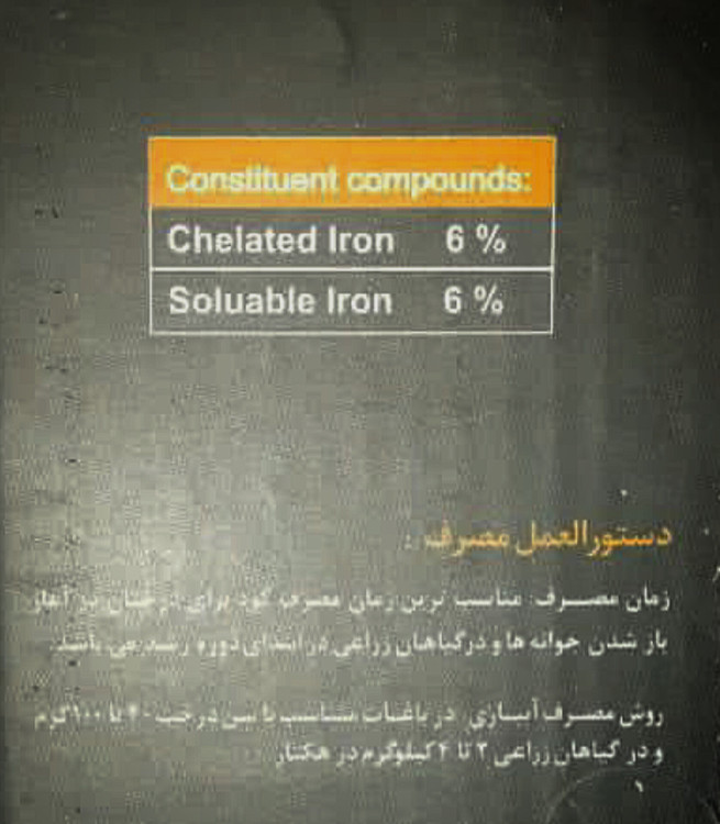 یک کود بسیار مناسب برای رفع کمبود عنصر آهن در گیاهان مختلف است. آهن از عناصر کم مصرف اما ضروری برای گیاه محسوب میشود و در بسیاری از فرآیندهای فیزیولوژیکی و بیوشیمیایی گیاهان همچون فتوسنتز، تنظیم فعالیت آنزیمها و کاهش میزان نیترات دخالت دارد. کمبود آهن در گیاه به طور کامل مشخص است به گونهای که برگهای جوان زرد شده ولی رگبرگها سبز باقی میمانند. و در حالتهای شدید رشد گیاه متوقف میشود.